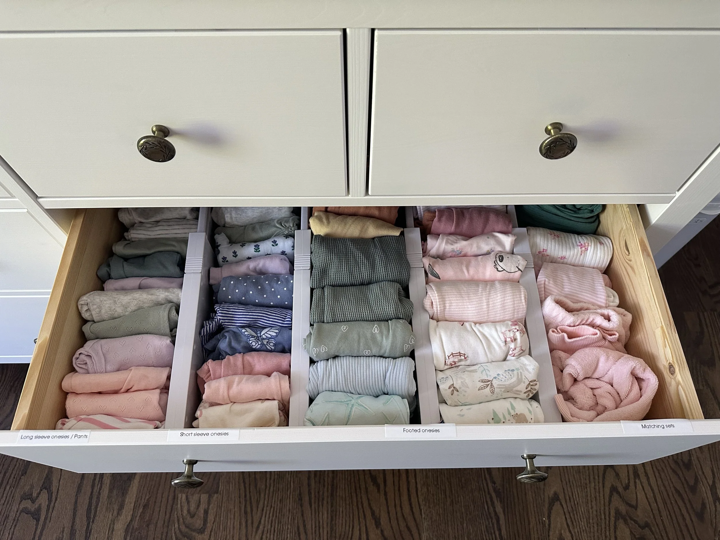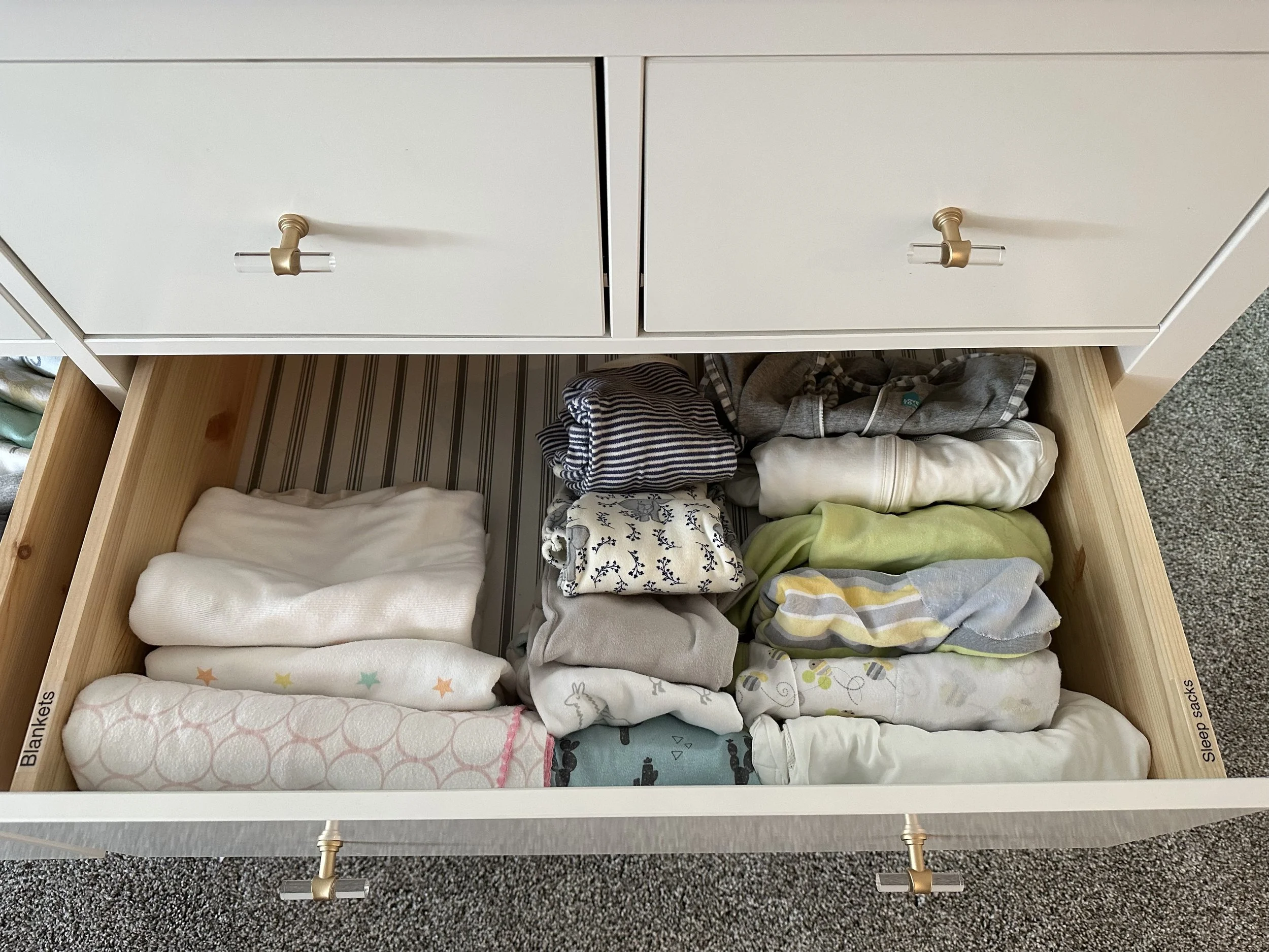 Top tip: If you have more than one or are going to, keep the clothes that your little one has grown out of. Once the grown out of drawer is full, transfer that one size to a clear 66qt container, label it newborn, so it's ready for number 2. You can also put all the other Newborn and Maternity things you used in that bin!